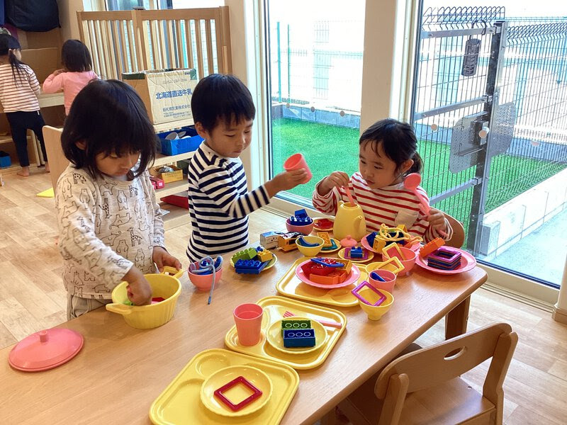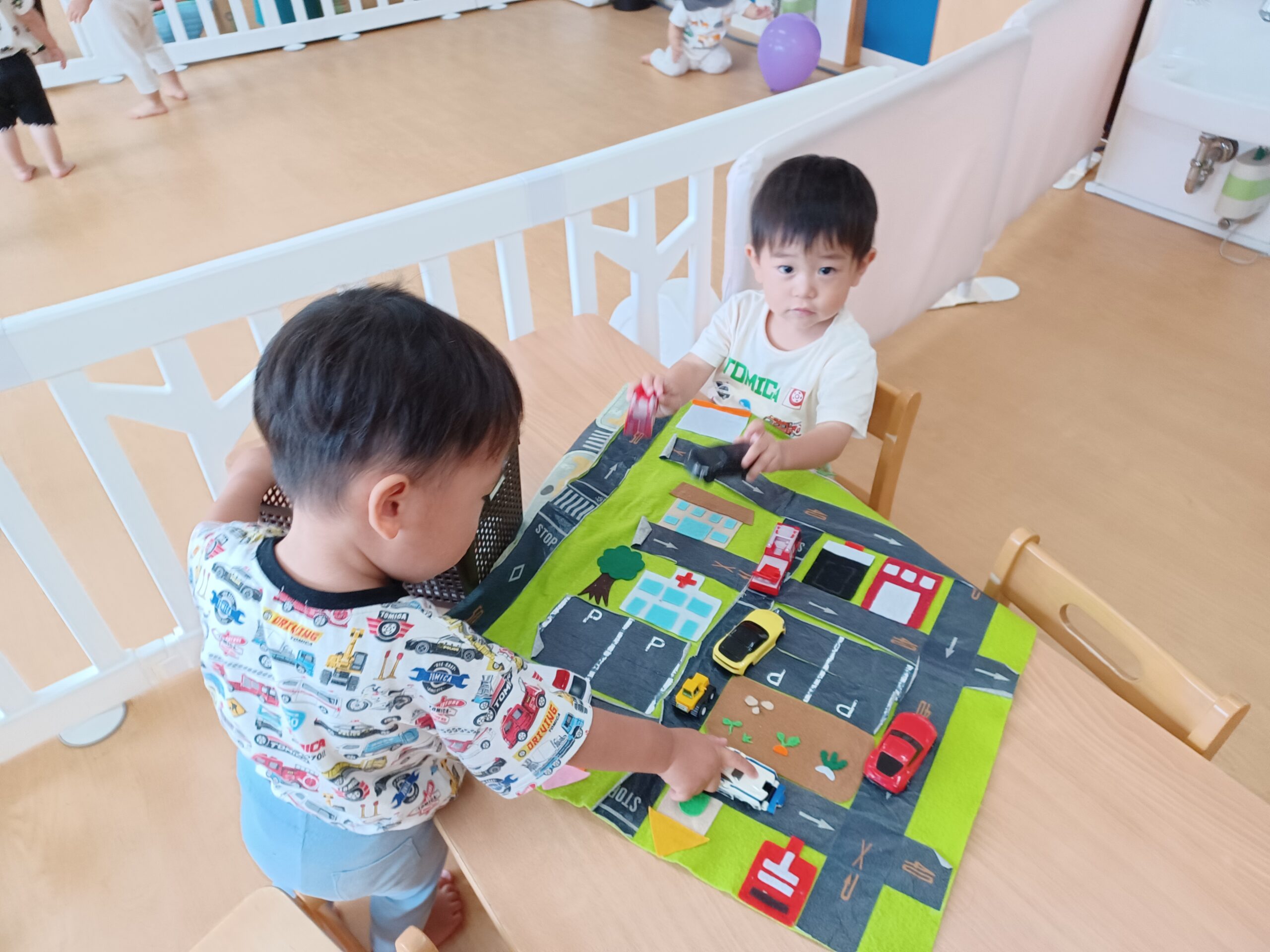 各コーナーに並べられたおもちゃの中から自分で遊びたいおもちゃを選んで遊びます。昨日の続きのブロックをしたり、新しいパズルに挑戦したり、登園してきたお友達とおままごとをしたりと子どものやりたいことはそれぞれ違います。そんな子どもたちの興味関心を大切にした環境設定の中で遊ぶことによって子どもの満足感を満たします。